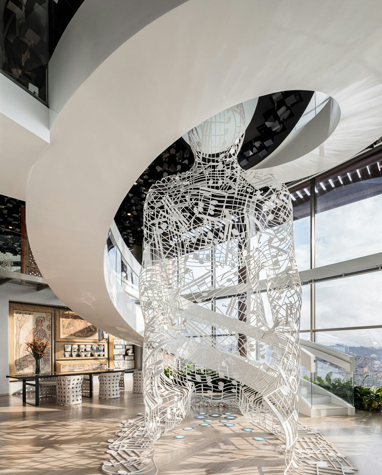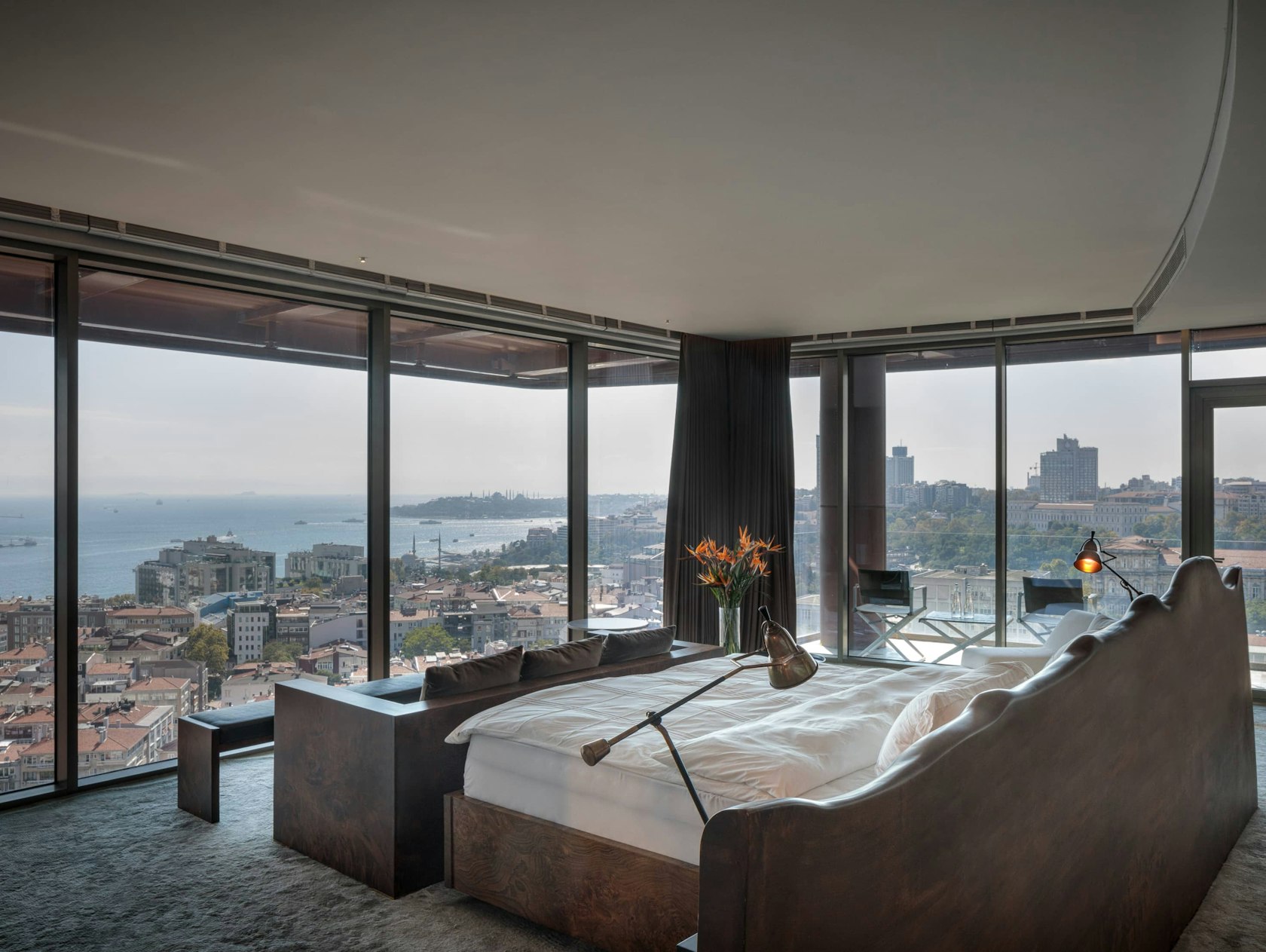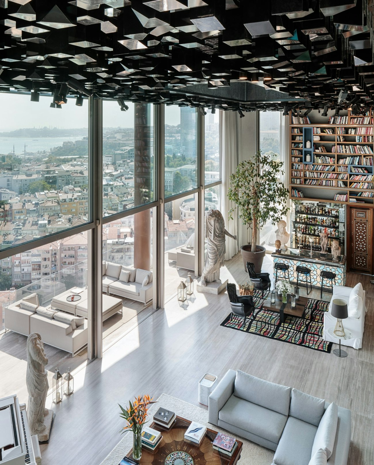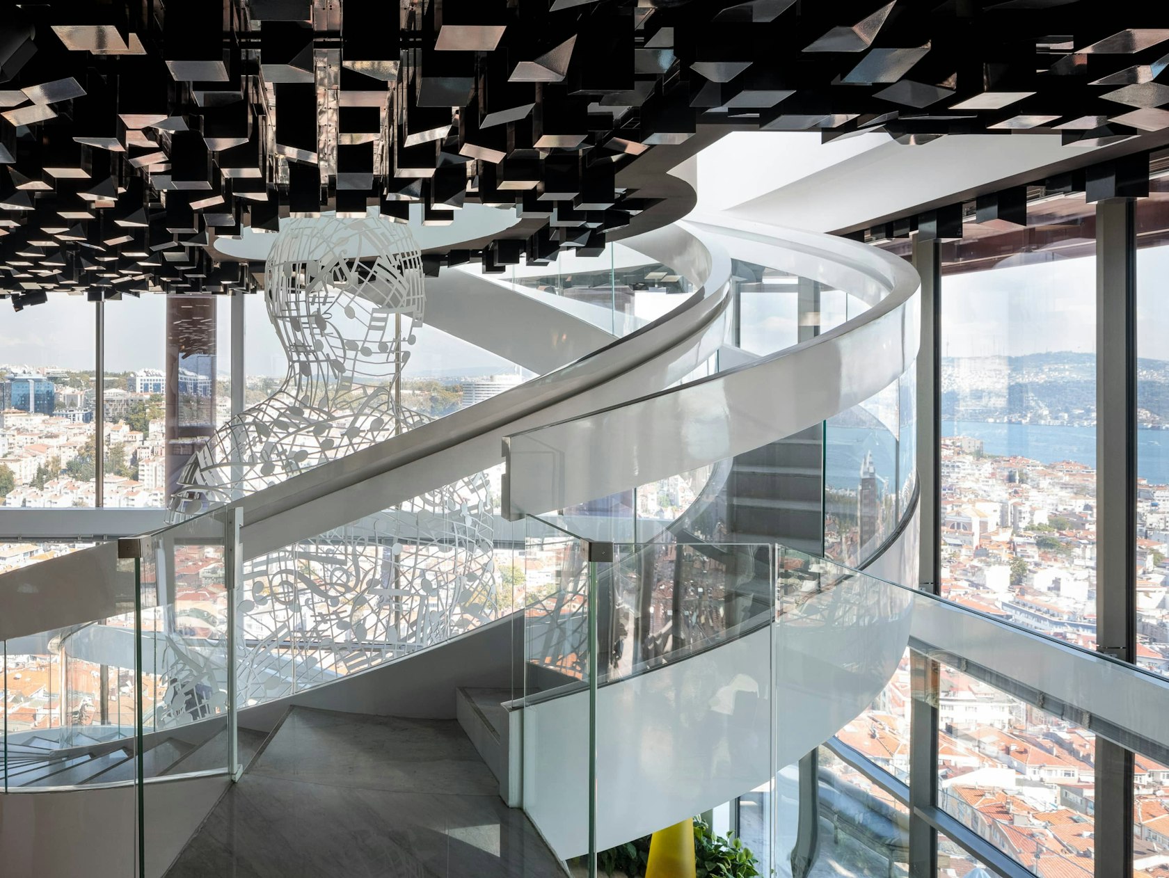 Perched on the tallest of the seven hills above the Bosphorous river we designed huge electric ‘guillotine’ glazed frames that slide to allow unbroken views from the Bridge to the Mediterranean Sea. A white helical staircase welded from steel sections on site by ship builders provides the visual link between the 3 floors surrounding Jaume Plensa’s stainless steel sculpture ‘Istanbul Blues’ brought fresh from the Paris Contemporary Art Show.