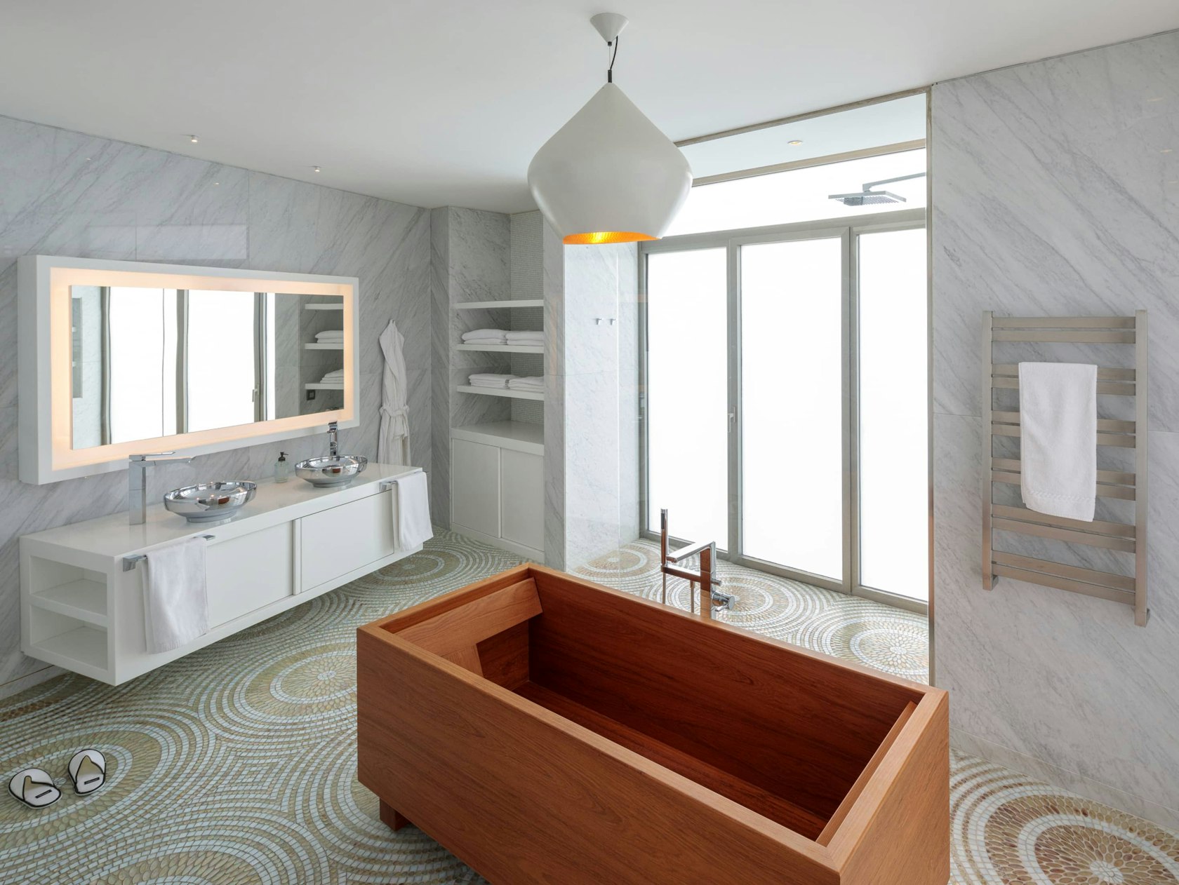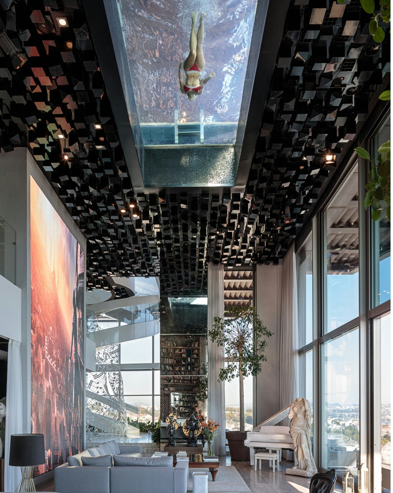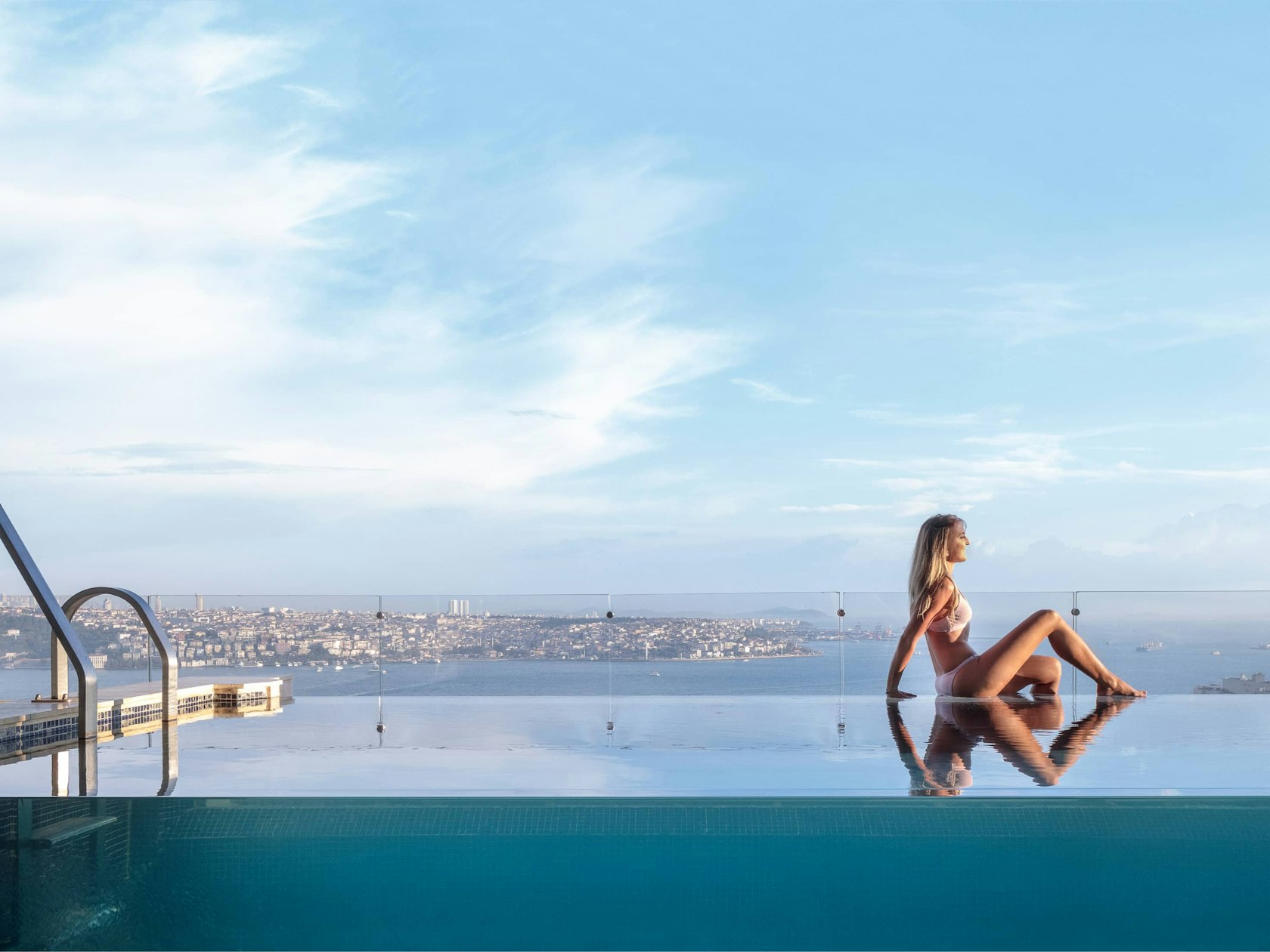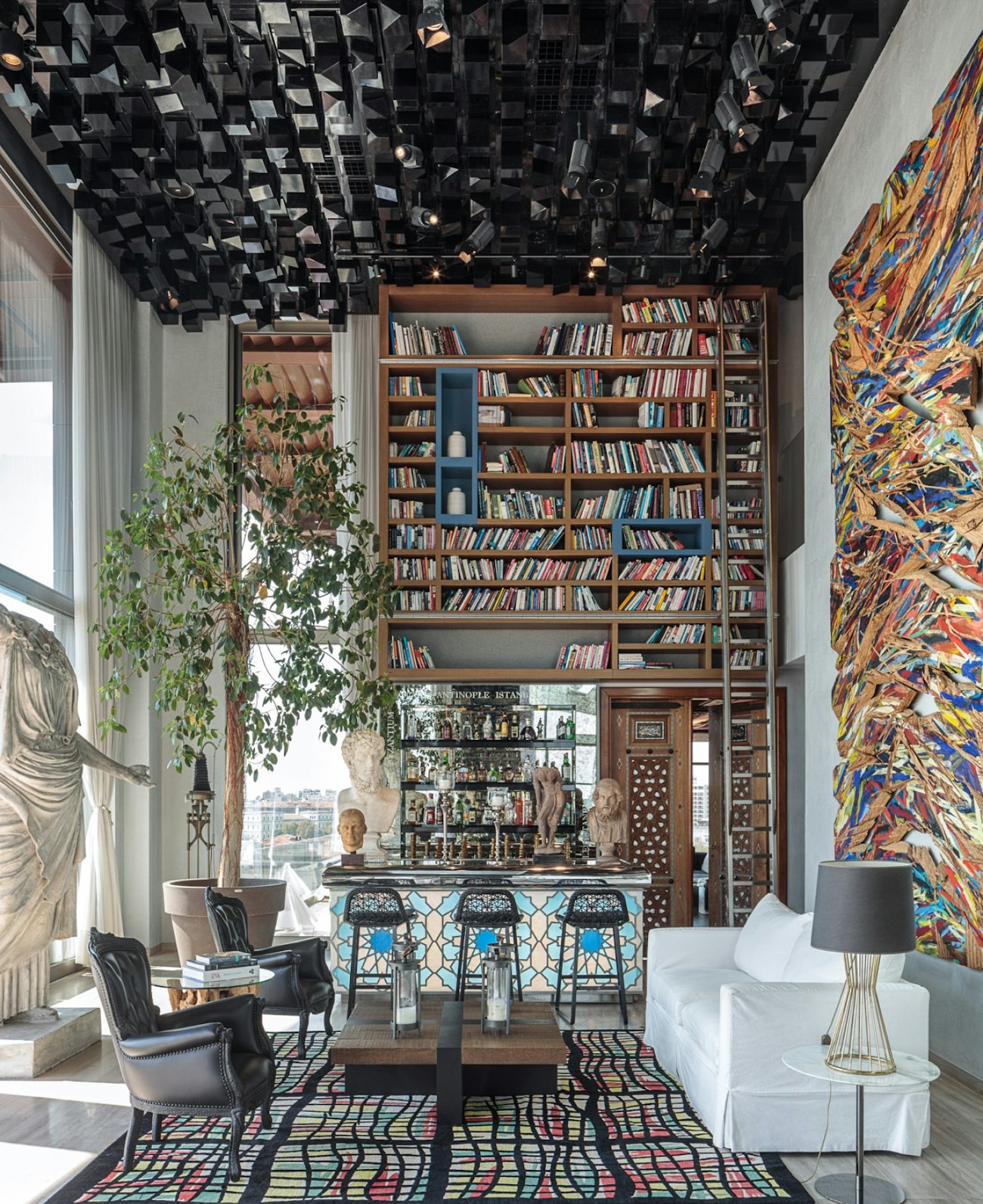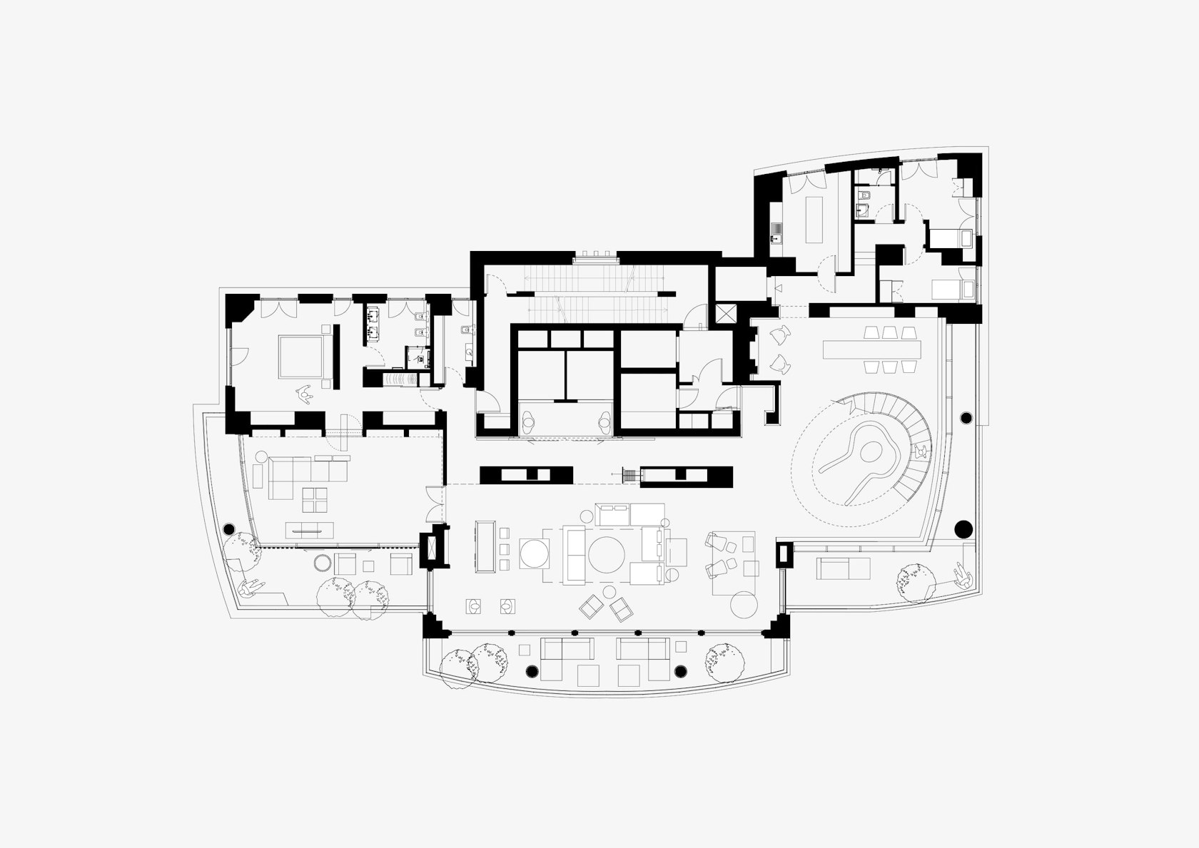 Perched on the tallest of the seven hills above the Bosphorous river we designed huge electric ‘guillotine’ glazed frames that slide to allow unbroken views from the Bridge to the Mediterranean Sea. A white helical staircase welded from steel sections on site by ship builders provides the visual link between the 3 floors surrounding Jaume Plensa’s stainless steel sculpture ‘Istanbul Blues’ brought fresh from the Paris Contemporary Art Show.